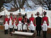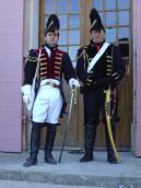C’est l’association dénommée Le service de santé de la Grande Armée qui est ici représentée. Il s’agit de la 2ème compagnie (Fig. 1). On y remarque deux des quatre caté- gories œuvrant au sein de ce service : chirurgien et infirmier. Le pharmacien ne figure pas sur cette photo, car il n’exerce pas au cœur même du combat (son uniforme sera présenté dans l’article publié dans la e-revue. Sur ce cliché, nous voyons les tenues portées par les infirmiers conformément au règlement prescrit. Le quatrième homme en partant de la gauche est le centenier commandant cette compagnie, le capitaine Contremoulin ; remarquons qu’il porte la fameuse épaulette qui sera, durant la Révolution et le 1er Empire, refusée aux officiers de santé, ainsi que le hausse-col. Le deuxième soldat situé à gauche est un caporal-fourrier reconnaissable à ses galons parti- culiers. Les guêtres noires sont utilisées lors du combat, les grises pour les corvées, les blanches pour les défilés, la parade. En temps de paix le col est blanc, et noir en campagne. Certains des infirmiers portent le shako, d’autres le bonnet de police utilisé lors des bivouacs.